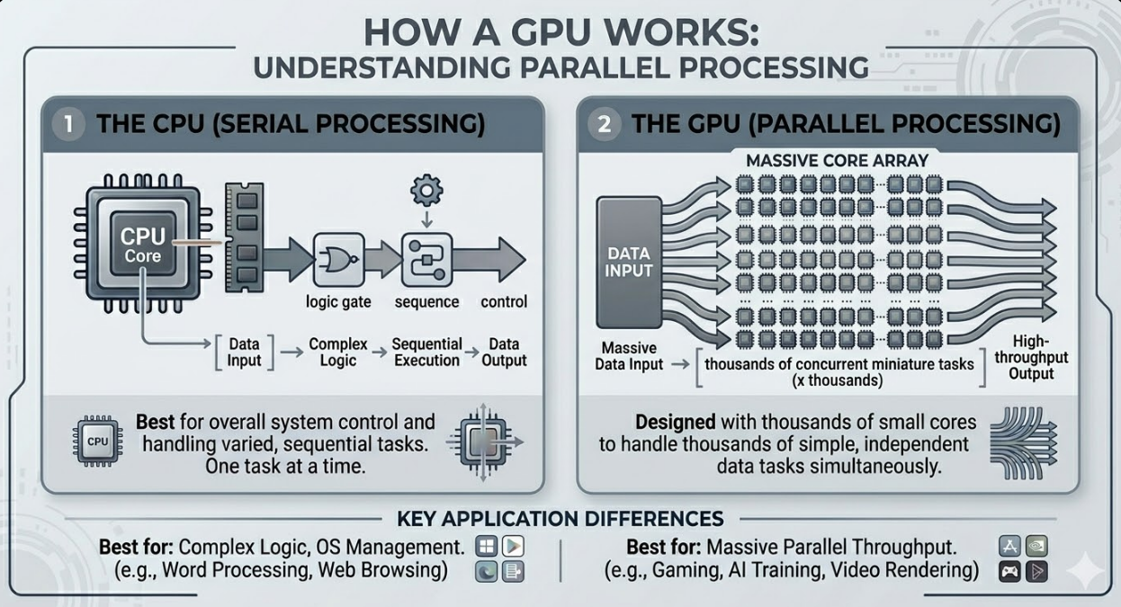 Unlike a Central Processing Unit (CPU), where tasks are done one after the other, a GPU takes a different approach by dividing and processing data in parallel.