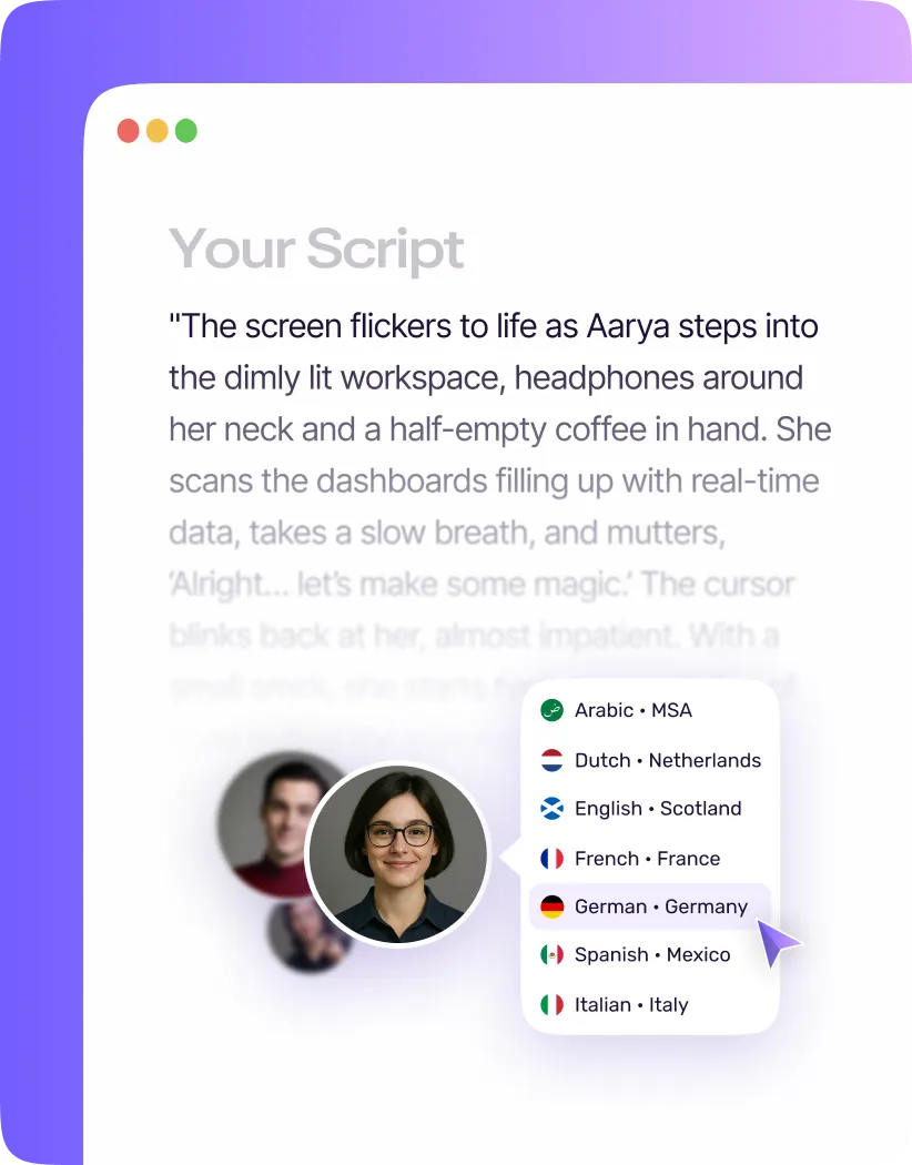 Design a short, conversational script with one clear objective. Select a voice from Murf’s library including custom voice options, and configure conversational prosody for natural intonation and pauses.