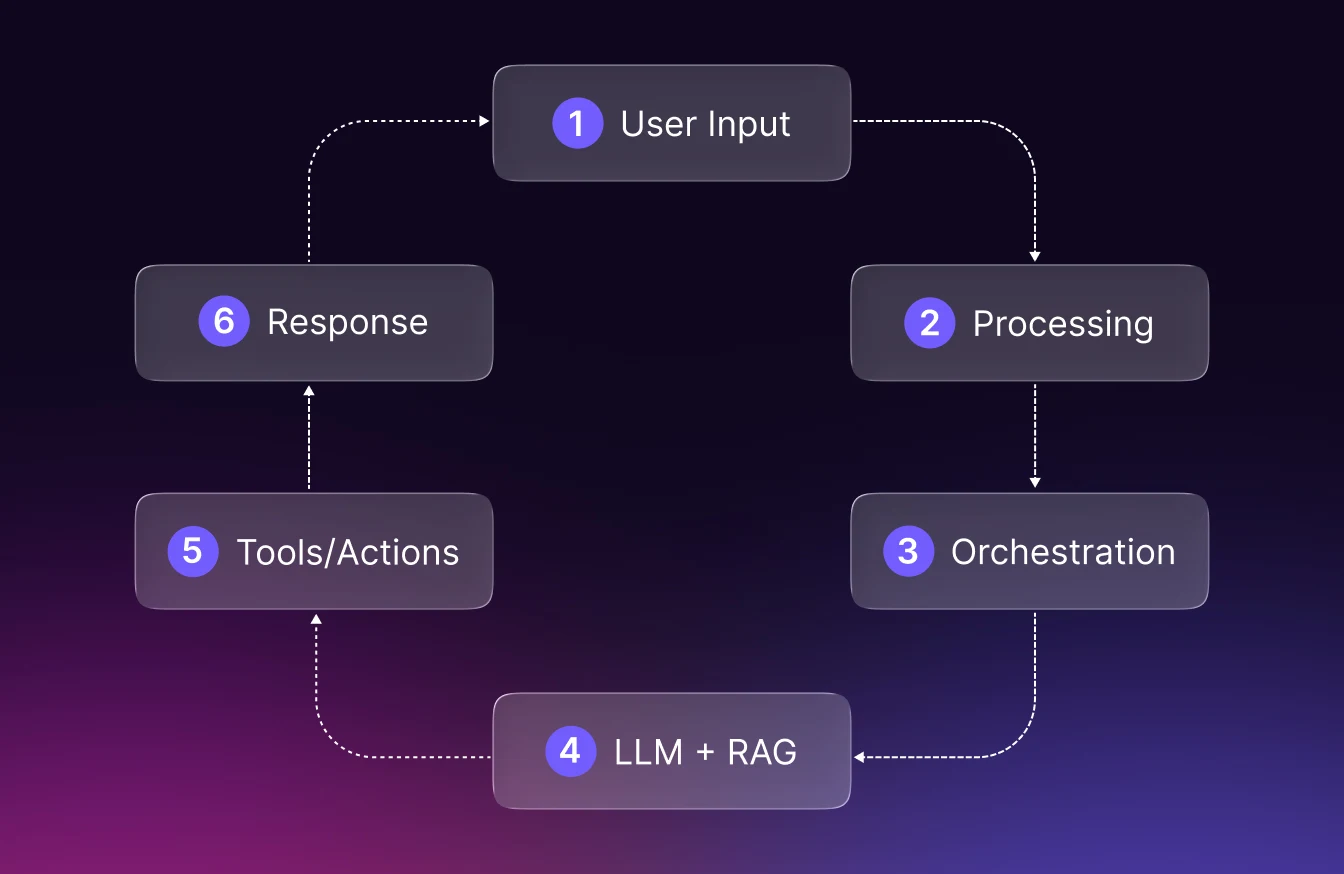 It begins with input processing using ASR (for voice) or direct text handling. An orchestration layer manages context and workflows, while LLMs interpret intent. Retrieval-Augmented Generation (RAG) ensures accurate, up-to-date responses by pulling from trusted data sources. The system can also connect to APIs or tools to complete tasks such as bookings or updates. Finally, responses are delivered via text or TTS.