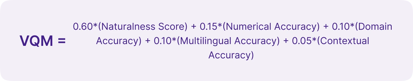 VQM is a purpose-built evaluation metric for voice agents. It provides a unified score that measures how natural, accurate, and reliable a voice sounds in real-world production. Instead of asking “Does it sound nice?”, VQM asks, “Does it say the right thing, in the right way, across complex, real-world inputs?”